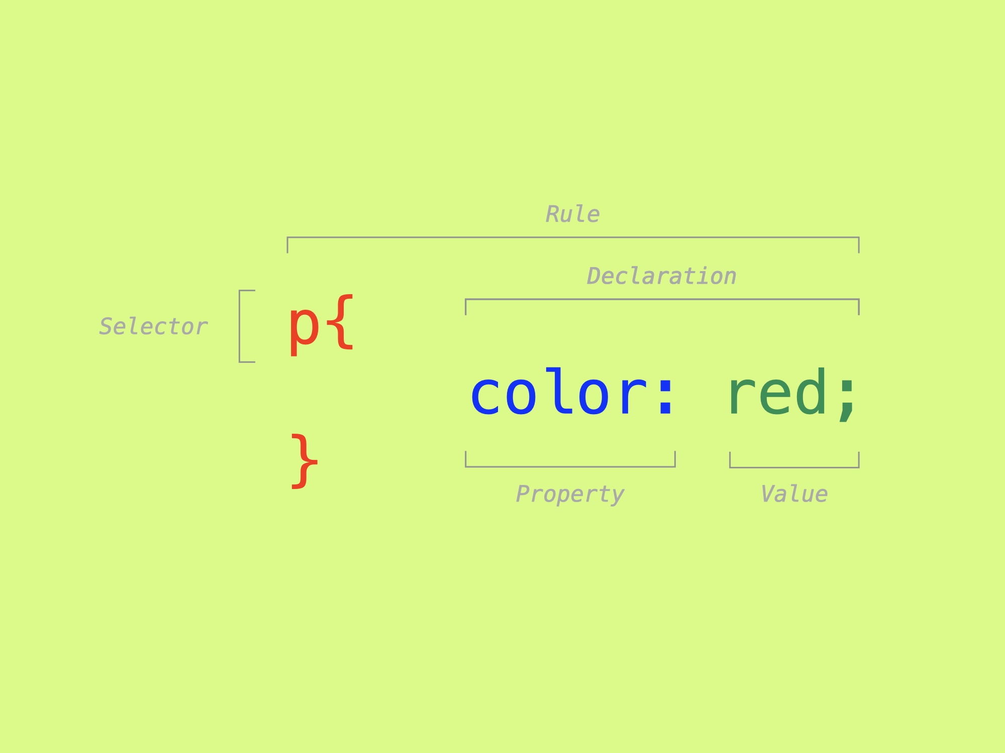 The curly brackets { } (also known as mustaches or handlebars, for their shape) enclose all the declarations you want to apply to a given selector. These declarations are in turn made up of properties and values.